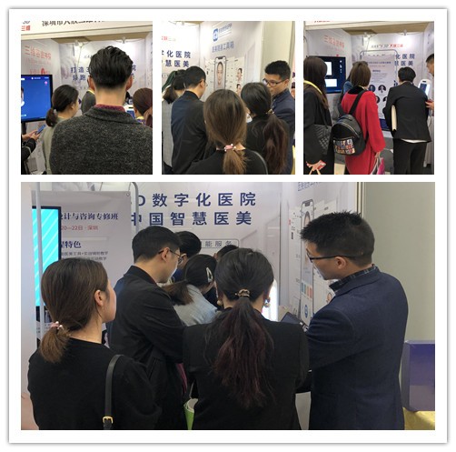 會(huì)客區(qū)中,現(xiàn)場(chǎng)熱(rè)鬧非凡,衆多(duō)咨詢師(shī)們接連不(bù)斷的(de)前來(lái)觀展,大(dà)族三™維展位裡(lǐ)贊歎、咨詢、洽談聲不(bù)絕于耳。咨詢師(shī)們向業(yè)務員(yuán)認真咨詢手機(jī)APP——醫(yī)拍(pāi)即合的(de)使用(yòng),在了(le)解大(dà)族三維的(de)産品後β贊歎不(bù)已。