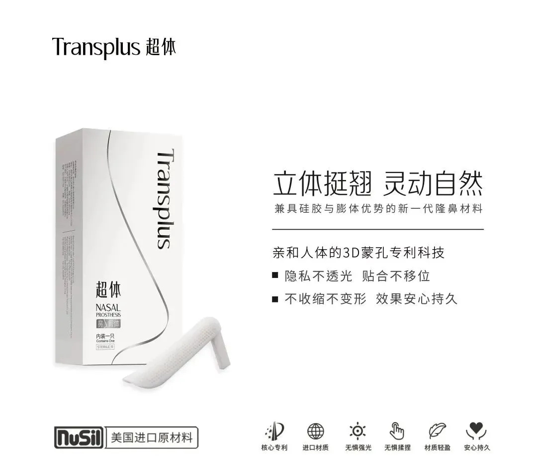 Transplus超體(tǐ)采用(yòng)美(měi)國(guó)NuSil醫(yī)用(yòng)矽膠作(zuò)為(wèi)基質,是(shì)兼具矽膠與膨體✔(tǐ)優勢的(de)新一(yī)代隆鼻材料,獨有(yǒu)的(de)“3D蒙孔”專利設計(jì),具備柔韌性好(hǎo)、無懼揉捏、不(bù)易透光(guāng)、穩固性好(hǎo)、抗感染能φ(néng)力強等優勢,術(shù)後貼合鼻型,立體(tǐ)挺翹、靈動自(zì)然~為(wèi)鼻整形手術(shù)中材料的(de)選用(yòng)提供↑了(le)更優的(de)選擇。