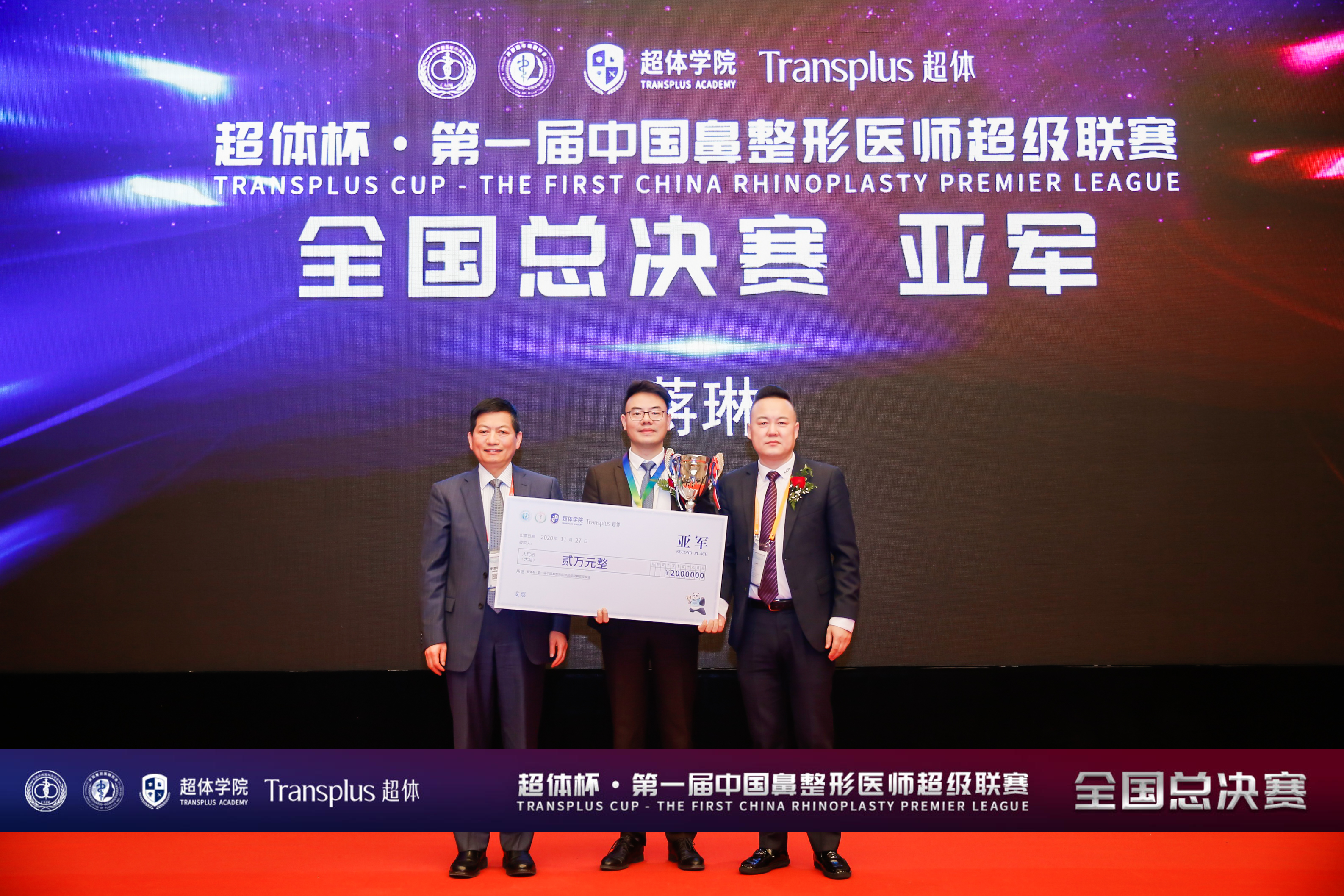 為(wèi)獲得(de)第一(yī)屆“超體(tǐ)杯”全國(guó)總決賽亞軍的(de)選手蔣琳醫(yī)生(shēng)頒獎