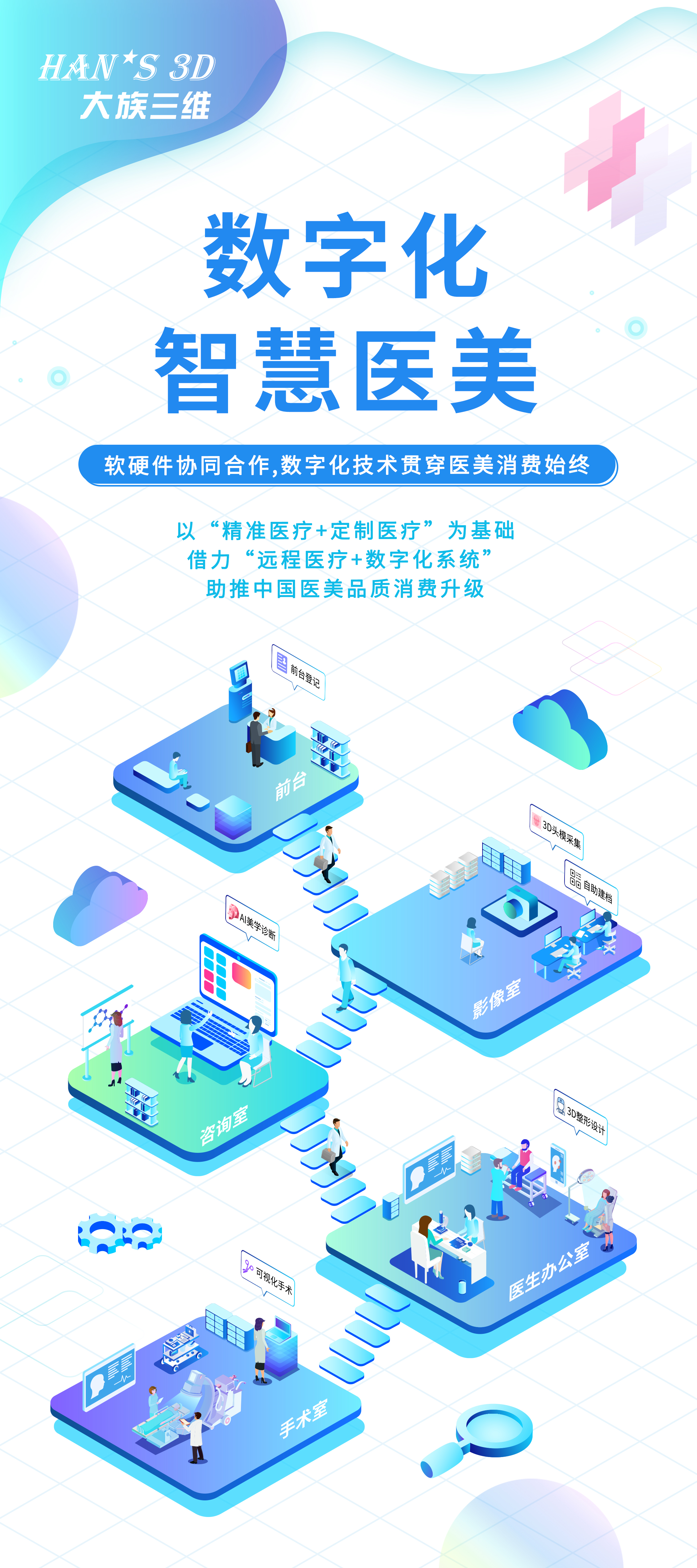 大(dà)族三維緻力于把科(kē)技(jì)、醫(yī)學、藝術(shù)與人(rén)的(de)幸福感相(xiàng)結合,推崇外(wài)表與內(nèi)₽在、人(rén)與社會(huì)的(de)和(hé)諧共生(shēng)。依照(zhào)此理(lǐ)念,本次展廳設計(jì)•表現(xiàn)的(de)是(shì):以藍(lán)色科(kē)技(jì)感為(wèi)主調、白(bái)色簡約感為(wèi)輔色,旨在向大(dà)家(jiā)傳達出大(dà)族±三維“讓未來(lái)科(kē)技(jì)服務于現(xiàn)在”的(de)願景。